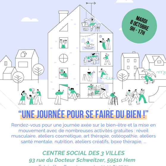 Rendez-vous pour un journée axée sur le bien-être et la mise en mouvement avec de nombreuses activités gratuite : reveil musculaire , ateliers cosmétique , art thérapie , ostéopathie , massage , ateliers santé mentale , nutrition , ateliers créatifs , boxe thérapie ...