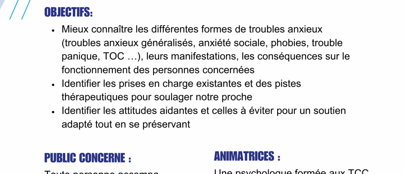 Une psychologue spécialisée en TCC (thérapies cognitivo-comportementales) et une bénévole de l'Unafam proposent à un groupe de 12 personnes maximum, concernées par un proche souffrant de troubles anxieux, une journée d'information gratuite sur inscription .